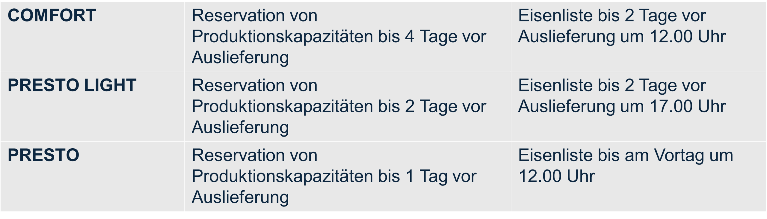 - Mit COMFORT leiten Sie Ihr Bauprogramm souverän in sichere Bahnen, indem Sie sich Produktionskapazität und Liefertermin bereits vor Fertigstellung der Eisenliste reservieren. Mit PRESTO wiederum meistern Sie mit wahlweise einem oder zwei Liefertagen ab Eingang der Eisenliste Kurzfristigkeiten jeglicher Art und schlafen selbst in hektischen Momenten ruhig.